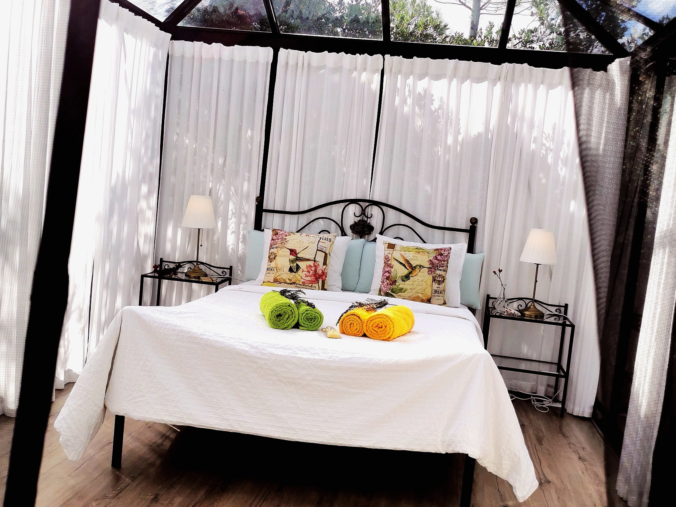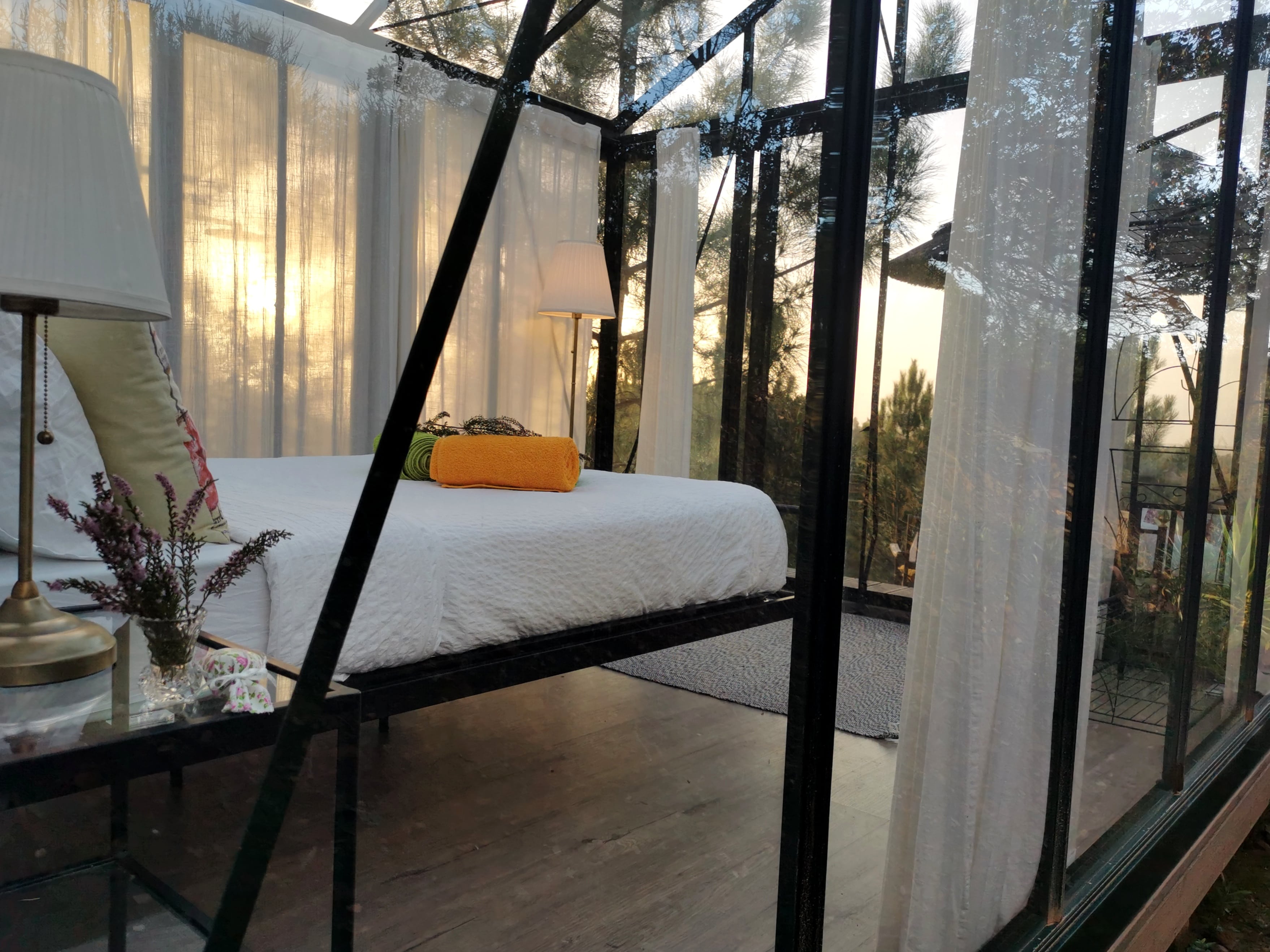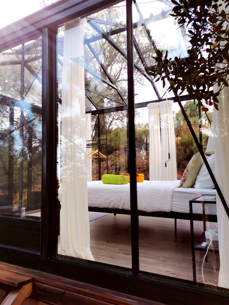 In unserer ersten Nacht im Glashaus finden wir kaum Schlaf, weil wir von unserem Bett aus fasziniert in den Sternenhimmel schauen. Am nächsten Morgen beginnt der Tag mit einer erfrischenden Dusche unter freiem Himmel – für High-end Outdoor Komfort ist gesorgt: das Wasser fließt wohlig warm auf Knopfdruck aus der Rain Shower oder der Handdusche.
